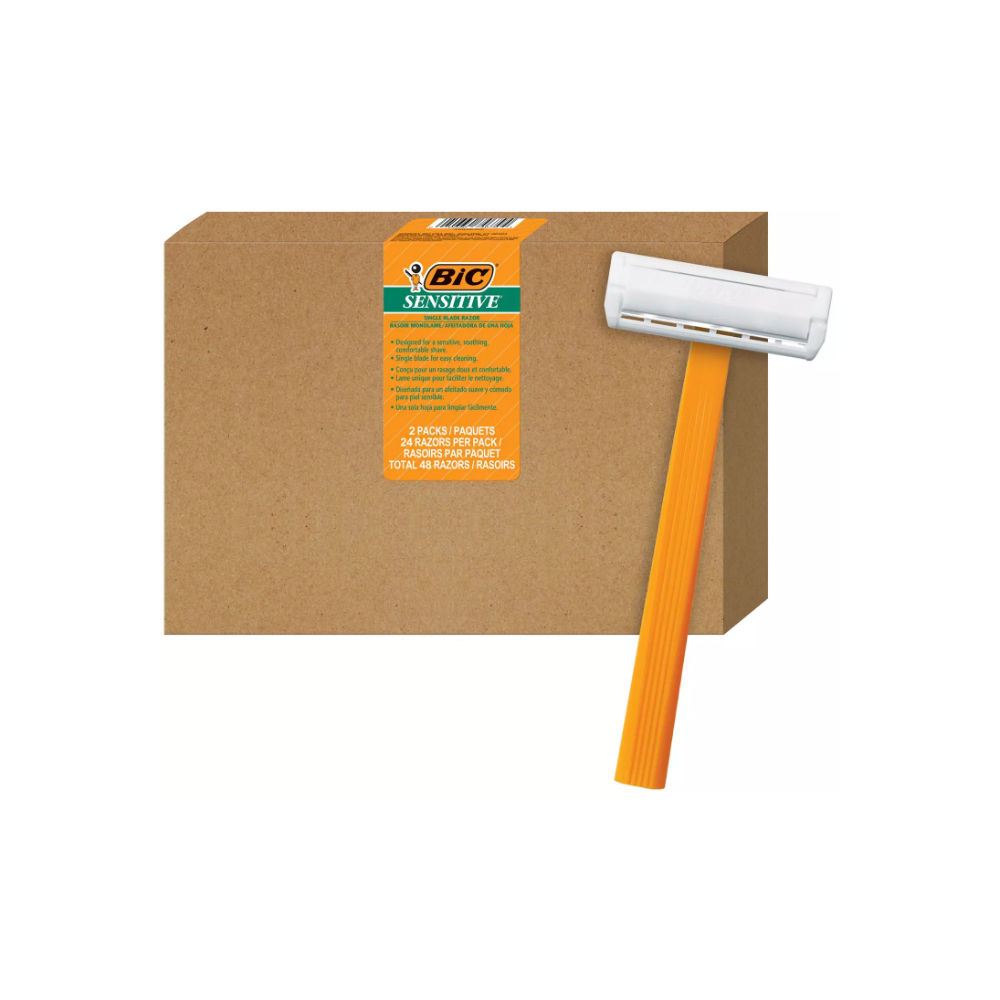 About this item Single blade disposable razor Designed for a sensitive, soothing, comfortable shave Plastic cover that snaps onto the razor head to protect it when not in use.